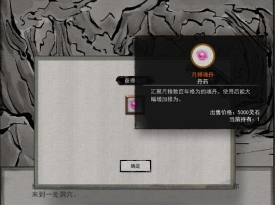 接下来就是剧情,然后选【岂能空手而归】,打一只蛤蟆获得一枚【月精魂丹】和一个十年期限的后天气运【月枝】,效果如下图。