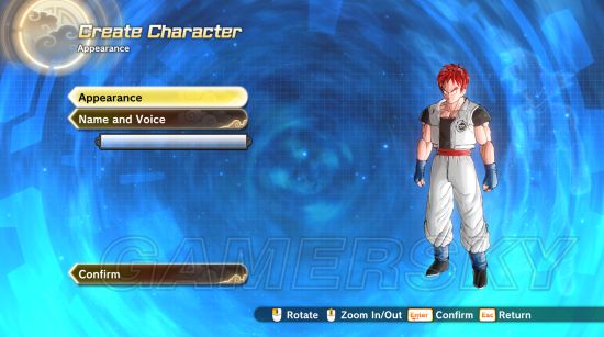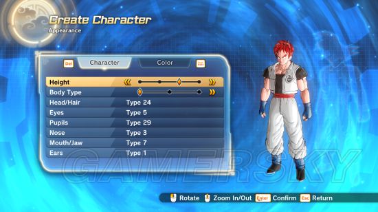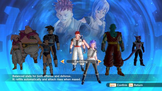 新建角色界面可以选择5个种族,分别是魔人、赛亚人、地球人、娜美克星人、弗利萨人。这里的每个角色都可以选择男性和女性角色,(除了最右边的两个家伙,一个高富帅一个矮穷丑。)选择的时候用键盘的方向键即可切换。