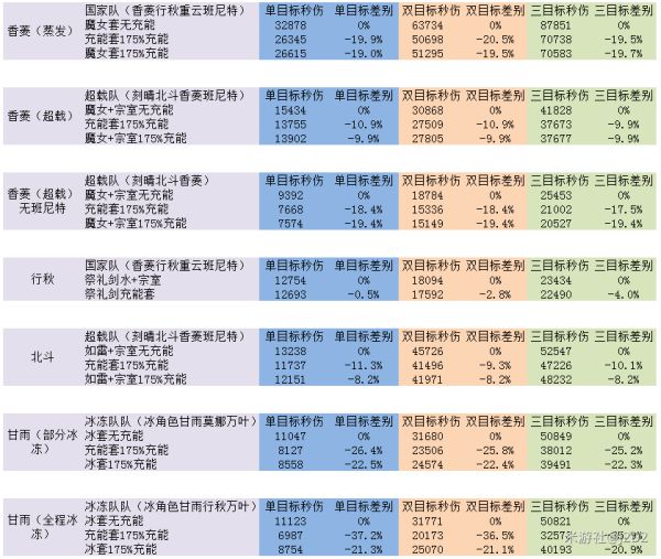 充能套的主要受众为充能困难的后台脱手角色,下图以香菱、行秋、北斗、甘雨为例,计算其穿不同圣遗物时的伤害变化。