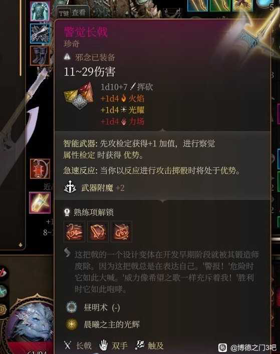面板很好的同时附带1d4力场伤害(光耀和火焰是我的装备和buff上的)还有+1先攻与察觉鉴定优势判定(双骰子判定基本不会被骗)反应攻击优势使借机攻击基本不会空,武器附魔+1极大提高dps,于月出之塔熊地精商人高价购买,可以通过战士对话说服拉满好感度降价购买。