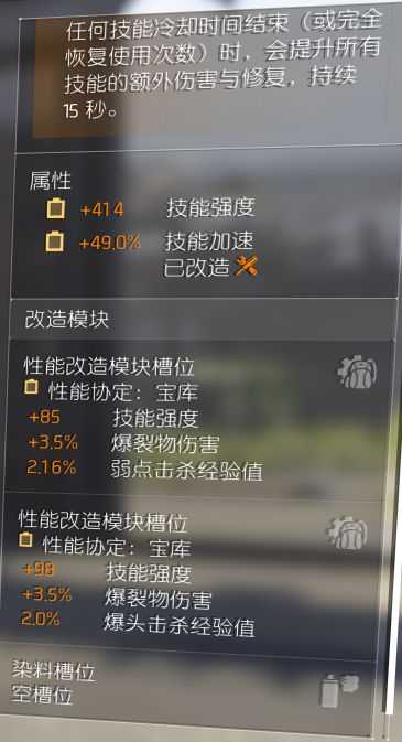 唯一难刷的就背包背心手套,炸狗的话因为精伤自带50干扰抗性,剩下三个蓝槽只要叠50干扰就可以,体感还不错,buff拉满260w,不拉满也可以轻松打出200w+伤害,溜溜球理想点其实应该是12秒cd50w伤害,可惜我也是个萌新,刚玩全境2很多东西都没怼,我这套我个人感觉只是刚刚成型而已。
