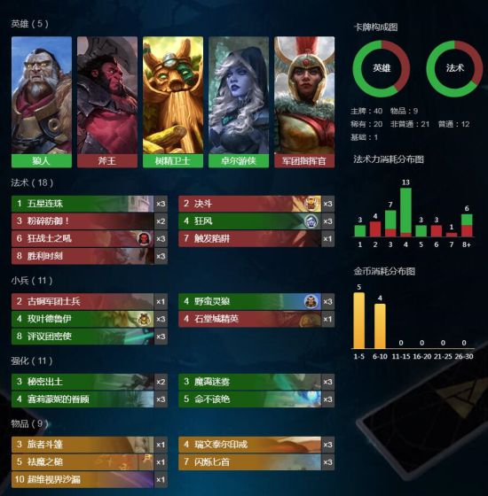 卡组思路:狼人,斧王,大树,军团作为优秀的站场英雄,前期能打出优势,既有加攻光环,又有护甲光环,身材又棒。赛丽蒙妮和五星连珠拉满,配合玫叶德鲁伊尽快的跳费,在8费时打出胜利时刻基本上就拿下了,这套牌就是容错率超高,一个字稳!