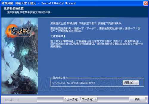3.在此页面选择《轩辕剑6》客户端在您电脑硬盘上的存放区域,确保您选择的硬盘空间足够,选择好后,“下一步”按钮。