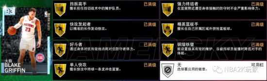 这张格里芬钻卡的六大项属性中有两项高光、一项绿区、三项黄区;进攻端这张卡稍有些投射,其实有一定投射能力的大个内线作用还是不小的,尤其是在线上对战中,这张卡空位三分83,算是靠谱的数值范围了;这张卡内线得分能力全线飘绿,最低的隔扣和背身控球也有着85的数值,其余各项均在90以上。防守端这张卡压线过关,持球防守69略低,横移65对位大内线基本够用,由于格里芬天生臂展不佳导致盖帽65偏低,但力量95,弹跳93可以稍作弥补,篮板能力综评92。这张格里芬身高208,打大前锋完全合格,MT模式中臂展的长度小编暂时没感觉到有多大的影响,总的来看,这张卡还是非常值得一用的。
