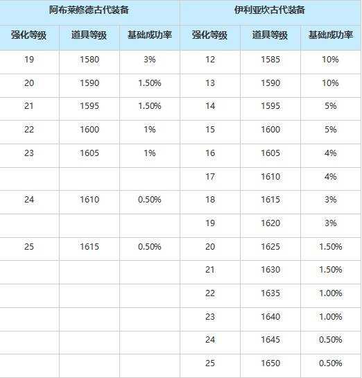 冒险家可以将阿布莱修德古代装备的道具等级继承至伊利亚坎古代装备上,套装的等级和装备的品质将会完全继承,而道具等级和相应精炼成功率则会遵循如下继承规则: