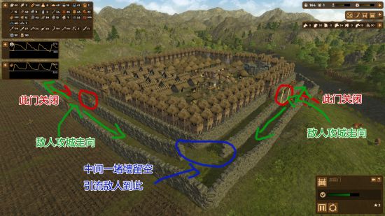 内外三层城墙,三道门作为出口,来敌人时候中间那个关闭。典型塔防蛇形防守!