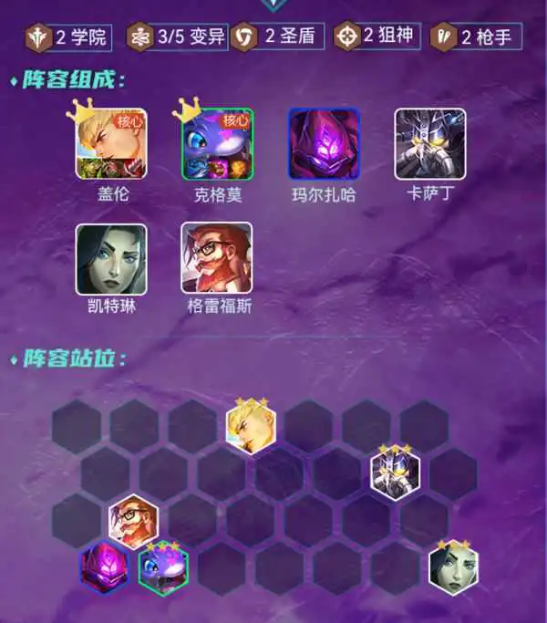圣盾大嘴作为多枚棋子赌3星得阵容是非常吃海克斯强化的,阵容成型的早晚,很大程度决定阵容能否吃分或吃鸡。阵容6人口在大嘴与盖伦均三星小成后,阵容才开始强势,中后期在给大嘴找5变异,只要不遇到非常克制的维克托主C都能有一个非常好的名次。