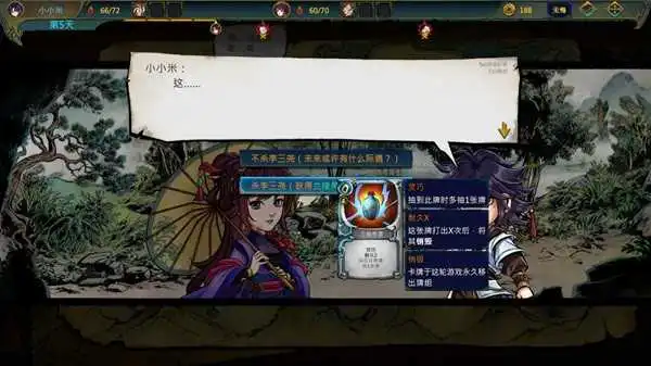 游戏还对所有这些NPC都进行了一些创新:比如升级卡牌不是任选而是随机六选一、然后加了个让人哭笑不得的“封印”功能,大概原本的初衷是限制卡池,可是封印里面经常都是各类裸拿都很赚的高级卡(参见上文,本作的卡牌不存在价值模型),总有一种我是撒币才会封印的感觉。还有比如旅店只能回30%的血,像多花钱多回也不行,除非做了野外救老板的随机事件可以增加到多花钱回60%——顺便本作的问号事件库是真的小,就玩一遍流程都遇到了好多重复事件,河洛几个武侠游戏那么多可用事件的,随便拿点现成的也比现在好吧?