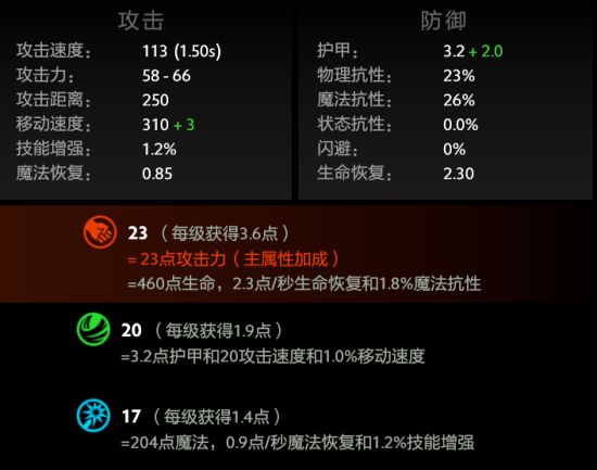 玛尔斯是一位力量型的近战英雄,他拥有310点的初始移速,初始力量为23点,每级3.6的力量成长。
