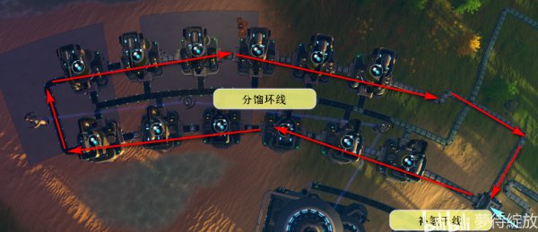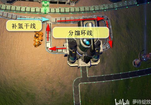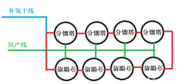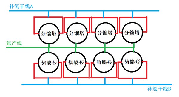 注意事项:要先摆好分馏环线,再将补氢干线接入,以保证环线优先级大于补氢线。你如果觉得不保险,可以用四向分流器设置优先输入,但每个环都需要一个四向分流器。