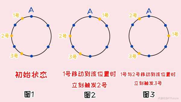 那么上述条件就变成了让3个仙灵移动时,两两之间保持2d的距离,即可解锁全部遗迹之烛。结合下图说明机关解锁流程(也就是按照下图的图1,图2,图3顺序操作即可):