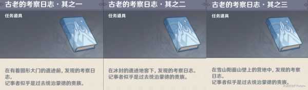 「覆雪之国」是1.2版本,蒙德雪山地区新增的世界任务,需要先在探索过程中获得关键道具,之后才会触发后续任务,而不是直接去找NPC对话。对于本任务来说,关键道具为「古老的考察日记」,共3本,找到其中任意一本即可开始任务流程。