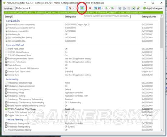 如果有意外情况可以再进到dishonored 2的配置页面里点那个图标恢复默认配置,退程序之前别忘了点右上角的apply。