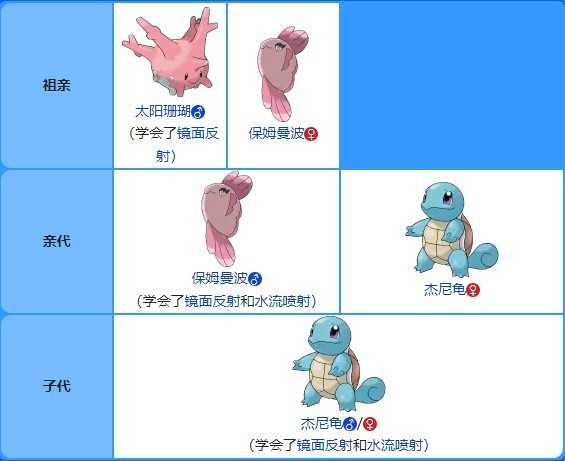 用太阳珊瑚♂和保姆曼波♀生蛋,得到“学会镜面反射的保姆曼波♂”,再通过等级提升学会水流喷射,就能得到同时学会所有需要遗传的招式的父方