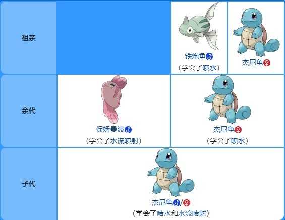 再以上述的杰尼龟想要遗传喷水和水流喷射为例,此例在这一世代起变为可行(这里的性别组合只是举例,不完全依照这样的组合进行培育也可能成功):