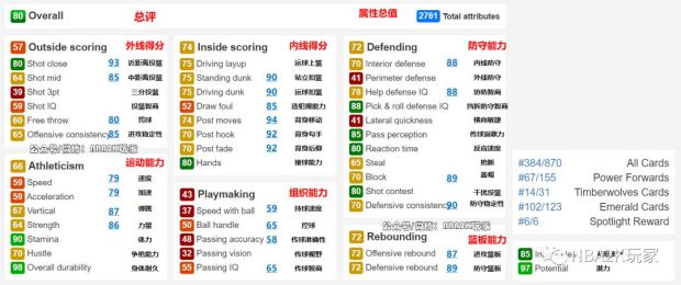 进攻端这张卡内外线能力都相当不错,90的中距离加上稍稍可用的78三分投篮;85左右的运球上篮/扣篮和背身后仰;此外他还有着一丝组织能力,在初期的球员卡里可以说非常全面。