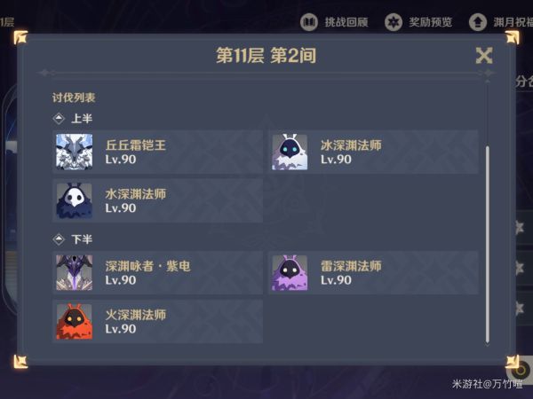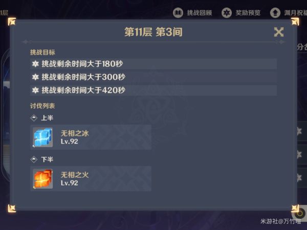 按照以上的怪物发布,我们可以上半带火系输出,而这层主要的难点在于11-3下半的无相火,部分玩家对于机制不熟悉,导致吃了亏,无相火和其他无相有些区别,首先他没有复活技能,但取而代之的是它开局会有一个类似火法的盾,盾的厚度可见,我们需要通过适合的元素反应进行削弱盾量,直至降低为0,才能对本体进行输出,蒸发反应削减最多,因此下半我们必须要带一个水系角色进行破盾,而且它有盾还不老实,各种乱跑放技能。