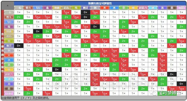 属性相克是宝可梦游戏中属性价值作用的直接体现,一种属性与另一种属性之间可能存在着抵抗、克制或免疫的关系。属性相克表直观地表示了攻击方所使用招式的属性和防御方宝可梦的属性两者对该招式威力所产生的影响。表格中只包含了一组属性的影响,而非多种属性。