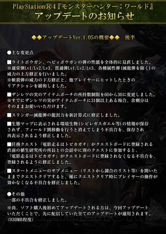 《怪物猎人世界》于近日提供了1.05更新补丁,下面为大家介绍《怪物猎人世界》1.05更新内容,本次更新修正了复制珠子BUG,修正了无法领取500万奖励的问题,斩裂弹也被削弱,一起来了解下。