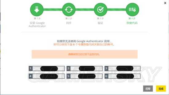 4.保存救援代码。救援代码是手机丢失或者不小心卸载了应用之后唯一的恢复手段。不要用手机拍照保存!否则手机丢失或者损坏后,你需要向客服求助以移除你的验证器。客服处理的过程可能会持续一周之久,在此期间你无法登录任何育碧游戏!