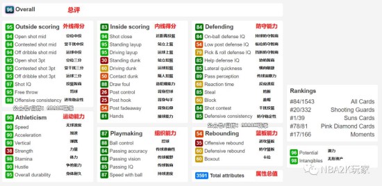 这张粉布克的属性总值为3591,进攻端完全依靠外线投射,94的中投三项和95的三分三项相当不错;但内线进攻能力较差,仅有常规的近距离和上篮可用。88的控球+87的运速稍有突破能力。