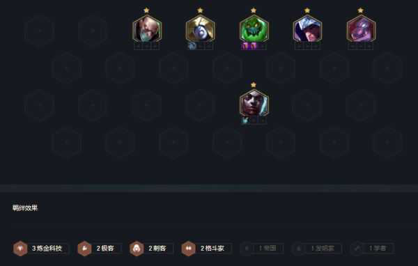 看自身装备情况,开局有圣杯就可考虑这套阵容,正常升级人口,不需要卖血拿装备,2-1升4,2-5升级5人口。争取连胜,打工阵容最优就是极客斗刺开局,圣杯给予卡特地,防装散件给予另一个斗士,多余散件看情况给炸弹人或EZ,有圣杯的情况下连胜还是比较容易得。