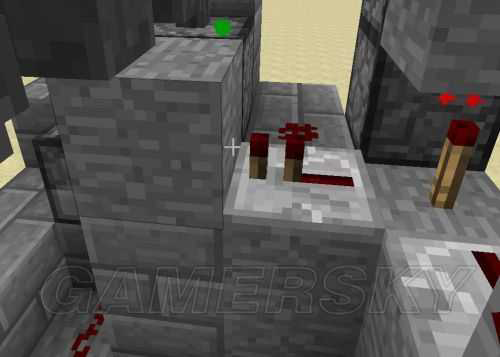 5.这一步是把高频脉冲信号连接给那个发射鸡蛋的发射器,但一开始我这里做错了,用的是后来截的图,乱入了很多东西,绿色点的地方就是那个发射器,希望大家能看懂。。。这一步需要加的东西是发射器后面的石头、右边的中继器、再右边的火把、火把下的石头。