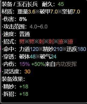 我都懒得讲软玉长兵的属性。太卜玄典和七星横链运起来,拿上一把硬玉对刺,直接拿长兵输出岂不是美滋滋?作为混伤催破,蓬莱仙尺在一众纯阳长兵之中,破体显得非常突出。五成精妙能点穴,聊胜于无。