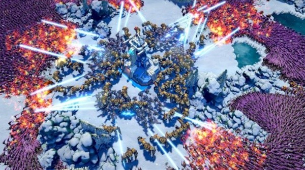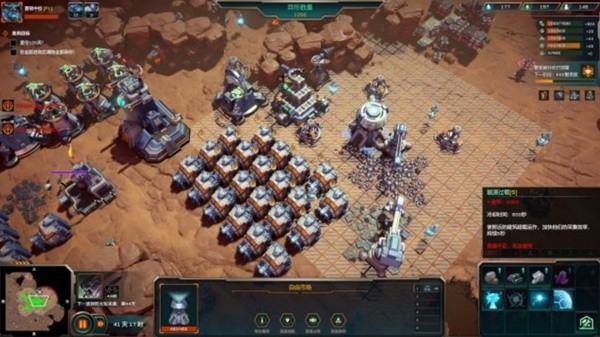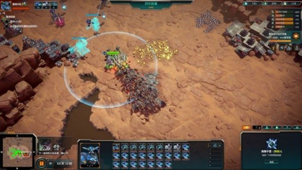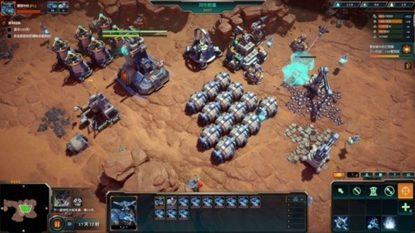 不同于很多种田转战斗的RTS后期无数兵营一起爆兵只看你操不操作的过来,在本作的生存模式甚至你1-2兵营用到尾也是没问题的,反正绝对没有更多的维护费用制造更多的部队。顺便,你还要在间隙不断的用类似于神族水晶扩大自己的可建造范围、用炮塔配合城墙守住路口、用雷达完成预警......所以生存模式漫长的发展时间和缓慢的游戏节奏大概是合理的,你也可以通过英雄带兵出去打野练级消磨这些时间,这样带来一个问题就是:你会几乎忘了这是一个生存游戏,而且打野的过程也太过于无聊了。