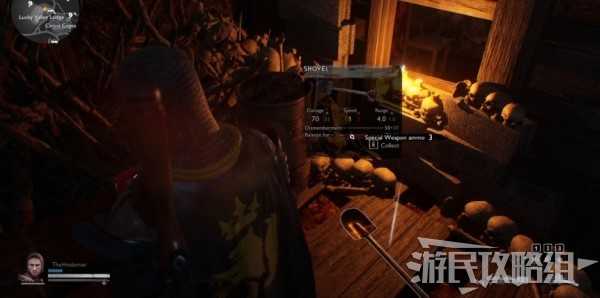 离开小屋后往北走,然后左拐进入另一栋建筑,继续搜刮物资,在地下室捡到护符和一把铲子(Shovel)。