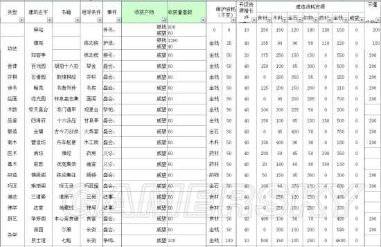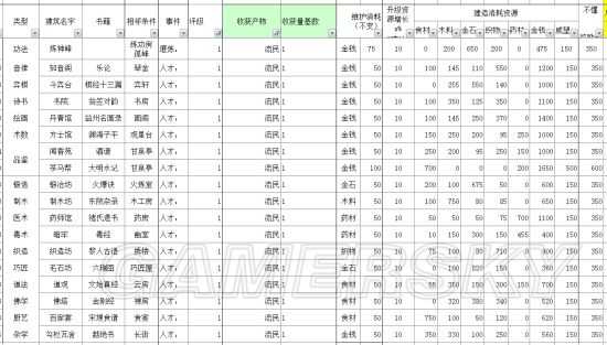 目前能介绍的信息:所有经营类建筑的收获产物和收获量基数,建造消耗资源量和升级消耗成长。