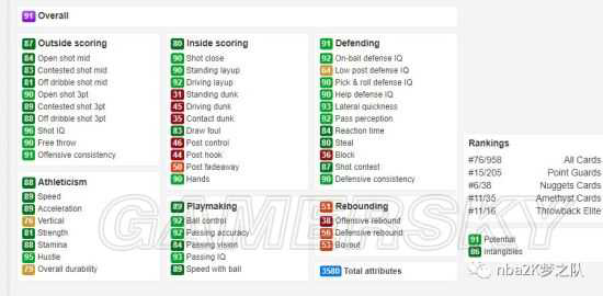 众所周知,比卢普斯将巅峰时期都贡献给了活塞,但其实他在掘金时也有着上佳表现,并和安东尼一起将队伍带到了西部决赛,可惜最终输给了科比的湖人队。这张比卢普斯的能力相当全面,他既有着精准的投射能力(空位三分90)、也有着出众的运动天赋(三速89、力量81)、组织传球更是不在话下(控球92、传球92)、防守也是一把好手(均值91、抢断80、横移93)。