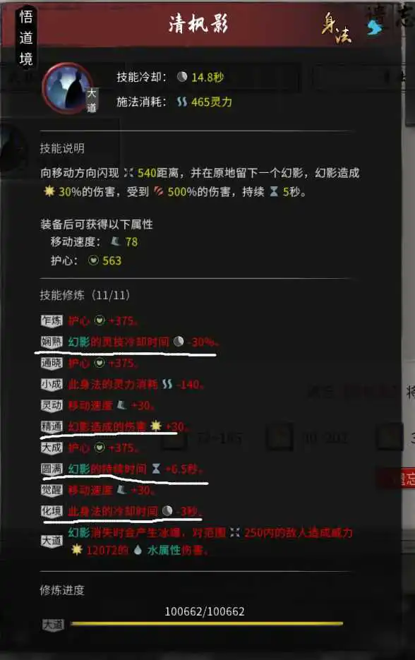 所需词条:武技冷却缩减,身法冷却缩减,身法持续时间(有这两个身法冷却缩减的词条,再配合上上面那个绝技引爆流血身法冷却缩减,就可无限身法,平A极快,而且还能使水系分身极为持久)
