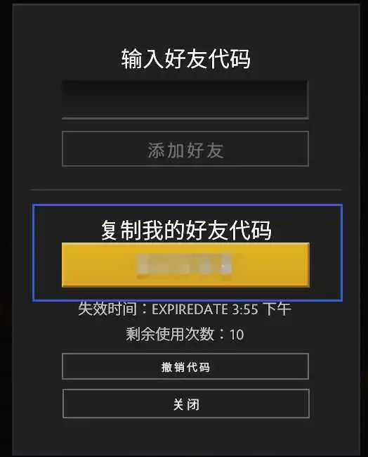 4.这样就能看到自己的好友代码了(图中蓝框)。有了代码后在上方输入其他人的代码,就能和对方成为好友啦
