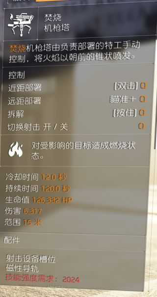 1.比如在大家都很喜欢的银行总部的最后一个场景,可以在掩体的左右靠前一些的地方放置火塔,不要启动,开怪之后怪过来找你就启动火塔,烧到也可以关掉省点持续时间,你的枪械输出比起纯电工要高很多。