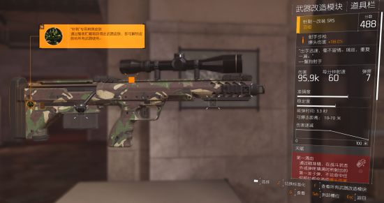 6.针刺-改装SRS射手步枪。该武器在神秘商人卡西·门多萨处购买取得。该武器的特有涂装树荫涂装在取得该武器后即可在服饰箱子内抽取到通用型的树荫涂装。其武器天赋/分数并不固定。