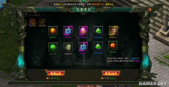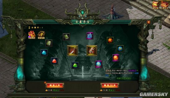 古墓寻宝是一个抽奖系统,根据抽奖类型的不同,抽取的奖励也不相同。玩家可以通过寻宝记录列表来确认自己的抽奖信息。探宝后会有一定比例的积分奖励,可以消耗积分在积分商城兑换其他物品。所有探宝获得的道具都会直接存入寻宝仓库中,也可以通过一键提取将探宝仓库中的道具转移到背包中。