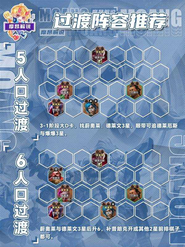 ● 3-1阶段大D卡,看对局节奏选择慢D或快D,摩昂喜欢卡20-30金币,找蔚奥莱、德莱文3星,顺带可追德莱厄斯与爆爆3星。