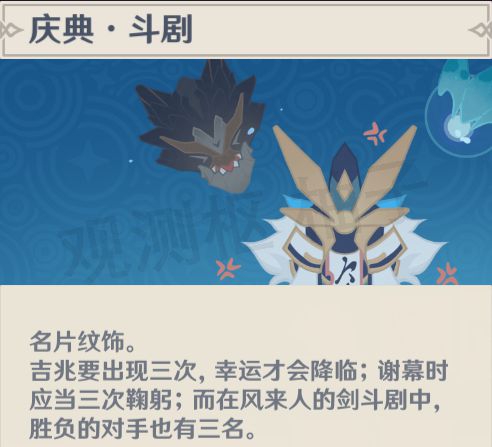 完成全部阶段的积分获取之后,一共可以获得36w摩拉、32本大英雄经验书、32个精锻用魔矿、4本各系列【指引】稀有度技能书。除此之外,在旅行者获得21000积分时,还能够获得一张活动名片:【庆典·斗剧】。