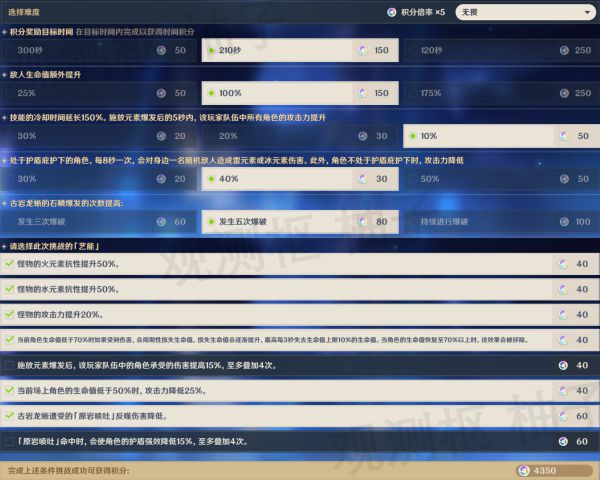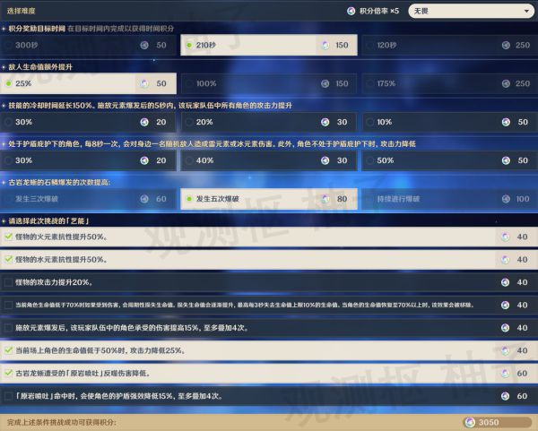 以下是两种难度选择方式,旅行者也可以根据自己的阵容与练度来更改因子。