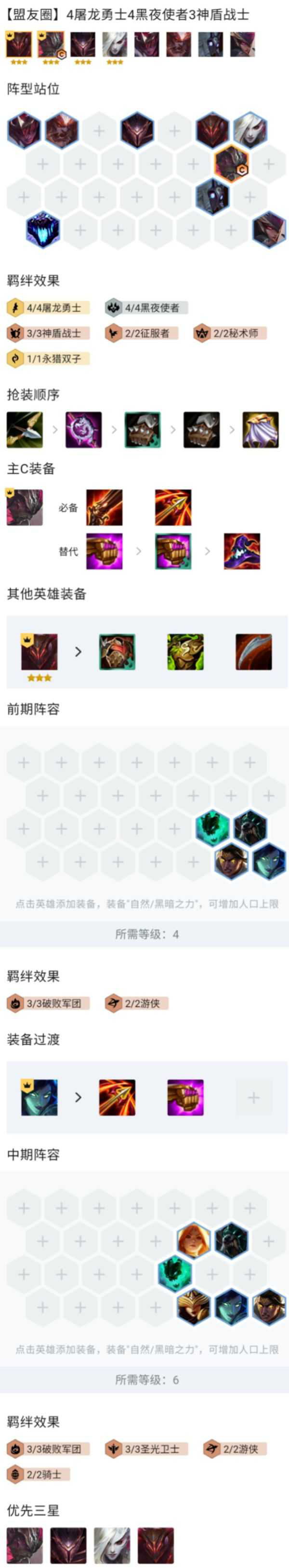 3-2上6级后可以凑出3破败3圣光的阵容来过渡,加成非常强势,如果有2星韦鲁斯或者2星VN的话可以轻松连胜。
