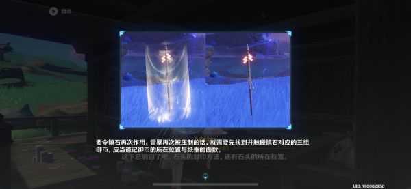 第二组镇石:按照任务指引来到平海砦下方的传送点位置。刚来到这里少了一个纸垂,不要慌,地图上为旅行者已经标明了第三个纸垂的位置,不过这里可以选择用新版本新的解谜工具:相位之门直接传送到跟前(如下图所示位置)。