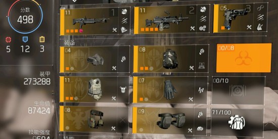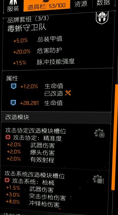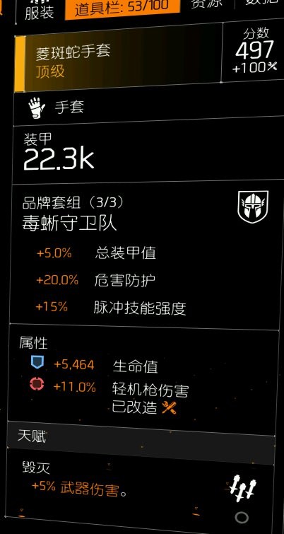 手套品牌也不定死。最好是村上,可以白嫖套装一个8生命值。毕竟毒蝎第三件效果没用,机枪伤词条最高12,这里因为生命太高导致11到顶了。
