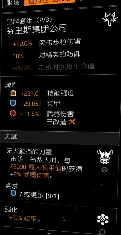 背心品牌选择不是定死的。属性关键是双蓝护肩,一红武器伤。然后犀牛。背心是加成属性最高的部位。词条强度很重要。