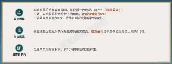 ①.圣显之钥的被动特效在后台无法触发,因此如果需要触发被动需要装备者利用元素攻击站场极短时间(搭配莱依拉的主要作用是提供大量生命上限,很大程度上提高护盾吸收量)。