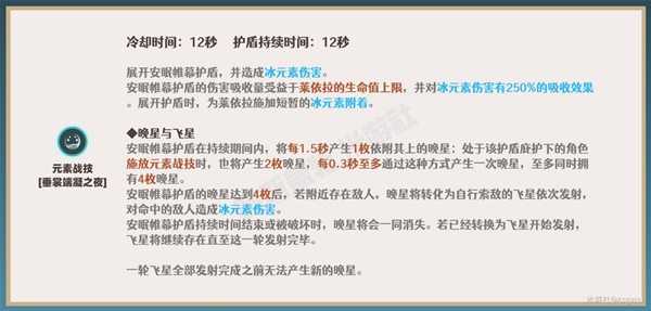 元素爆发产生的星光弹为弱冰元素附着(1元素量,9.5秒),且遵循“2.5秒内每间隔2次攻击产生元素附着”的规则。