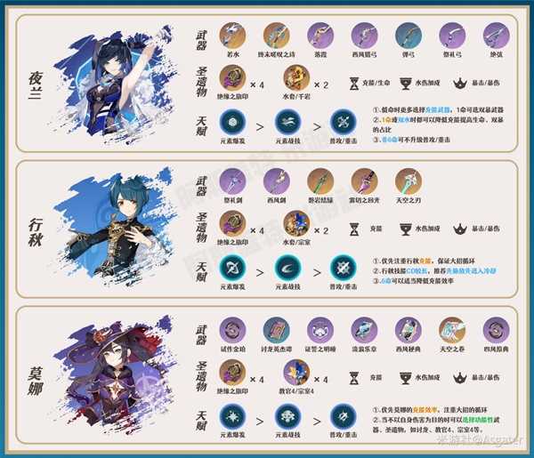 【注】优先考虑夜兰、行秋、莫娜的充能效率,以保证大招可以循环,双水组合时,0命夜兰推荐180-200%充能、1命夜兰推荐在150%左右充能;行秋非6命时推荐200%左右充能,6命充能推荐在180%左右;莫娜充能推荐在200%左右。