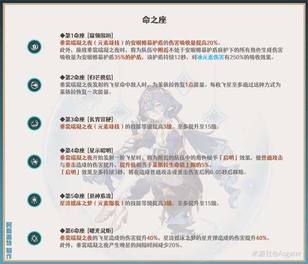 总体上,莱依拉的命座功能性改善更多是在1、3、4命,提高吸收量、提高普攻/重击的伤害。对于4星角色而言,命座则是越高越好。