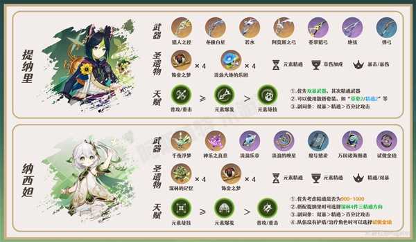 【注】提纳里的暴击率推荐在70-85%,双暴类武器时暴伤推荐在200-220%,非双暴类武器时暴伤推荐在160-180%;