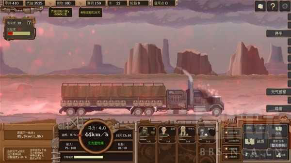 不过,游玩时并不能只关注货物,还得进行相当多的资源管理。需要在不同的地方额外收集合成材料以更大程度提升团队的能力;需要留意队友们的健康、饥饿、疲劳、压力;需要注意车辆状况、负重,其中作为金钱交易的“零件”也可能会占相当大的重量;做任何事都会消耗游戏时间,所以时间也是必须要管理的一部分。